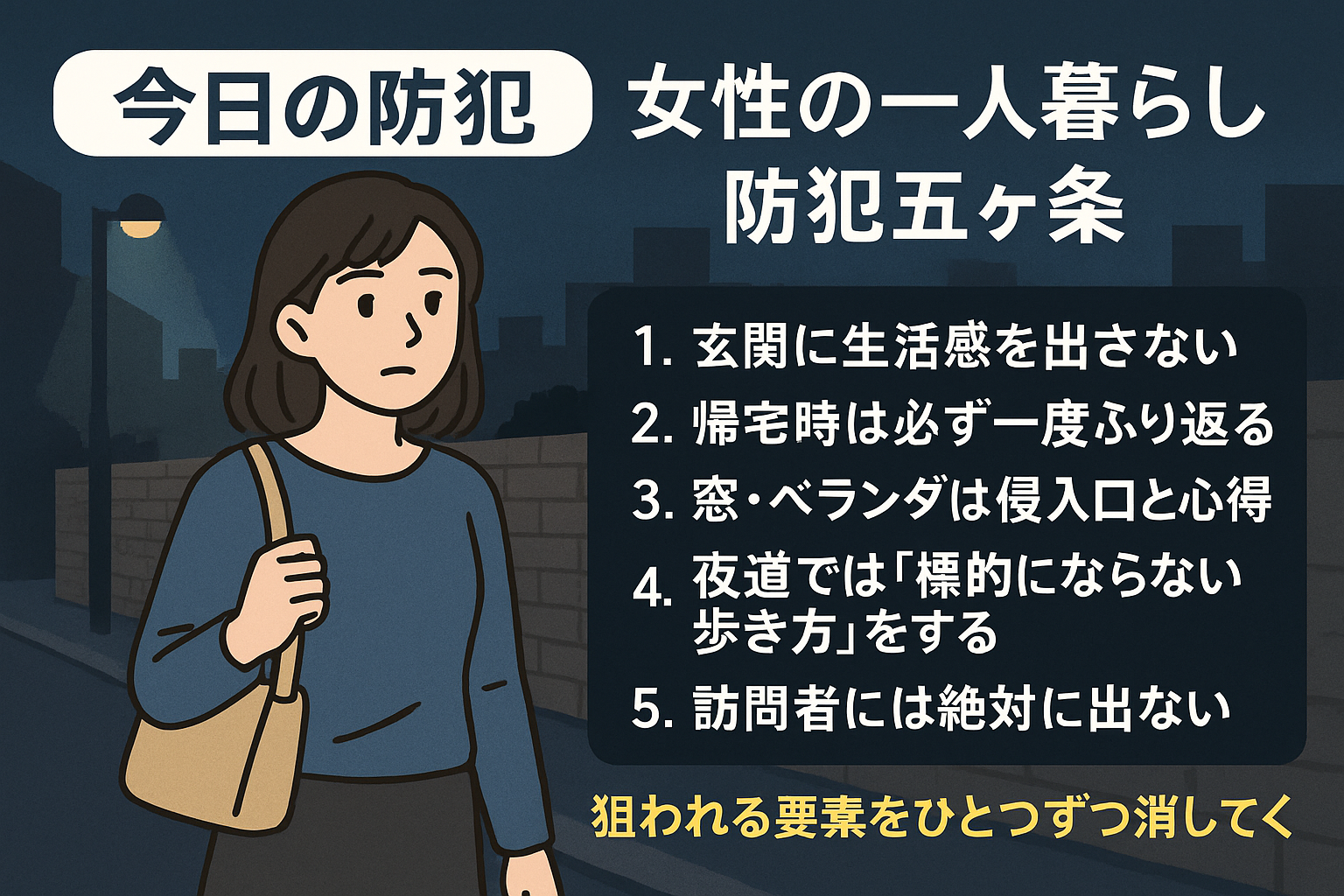 #今日の防犯 #女性の一人暮らし #防犯五ヶ条 #夜道防犯 #帰宅時の危険 #警備大学校